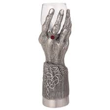 The gnarled but powerful Hand of Gandalf bears the Ring of Fire, Narya the Great. Known also as Mithrandir to the elves and Tharkun to the dwarves, Gandalf the Grey was a powerful wizard who received Narya from Cirdan the Shipwright and became the only non-elven bearer of an elven ring. Narya was crafted by Celebrimbor, the celebrated elven smith who created Galadriel's Nenya and Elrond's Vilya. Gandalf's knotted digits clasp a clear drinking cup suitable for port or sherry. The drape of his sleeve conceals a flute, perfect for wine or champagne.